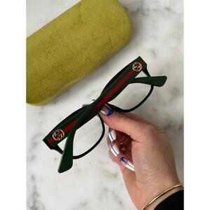 Black thick rim cat eye frame with green and red green striped legs and GUCCI gold logos on both legs.