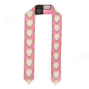 The Gucci Snake and Rhombus Print Neck Bow in Pink is crafted in Italy from pink and ivory silk. This scarf features the interlocking GG logo as a base pattern, a snake and rhombus print, and pointed ends.