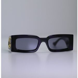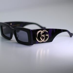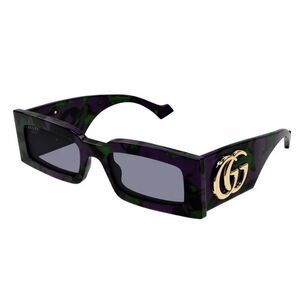 A distinctive feature of these sunglasses is the bold temple construction adorned with the Gucci running logo, adding a touch of brand recognition to the design. The extravagant color palette combines a unique purple and green havana frame with grey lavender lenses, creating a stylish and eye-catching look suitable for various occasions.