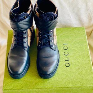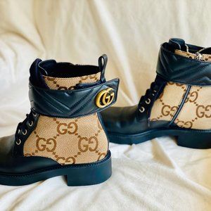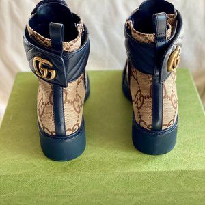 Beige and ebony maxi GG canvas with black leather details, Double G ,Lace-up and ankle zip closure, Low heel ,Heel height: 1.6", Boot shaft height: 6"
