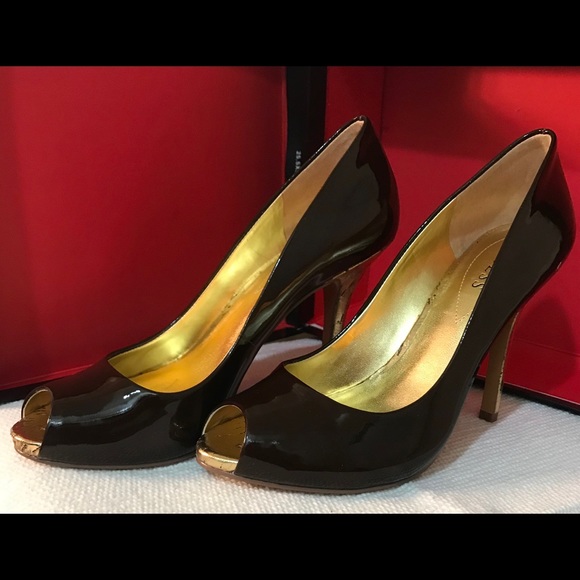 Elegant brown patent 3” hills with peep toe. Stunning gold pattern hills make this a keeper. Original Box
