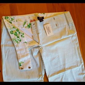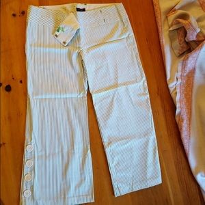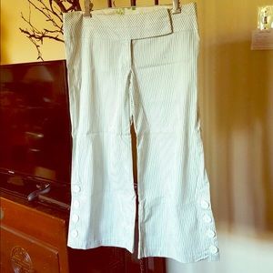 Brand new GUESS super cute palazzo pants with subtle yet fun green-and white stripes. NEW with tag. Size: 30. Front tab. Pant legs have 4 large buttons, and can be opened, with pretty floral lining.