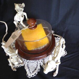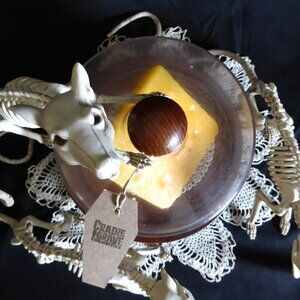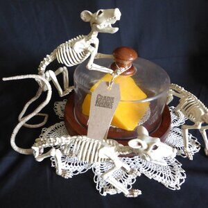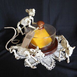 New, never displayed, Halloween prop entitled, “Say Cheese!” Created by “Cradle to Grave Curiosities. Features 3 skeleton rats having died from starvation from not being able to get to the cheese wedge under a food cloche. The cheese wedge is made of wax. The cloche is made of a plastic dome with a wood handle and footed base. Comes with a vintage decorative lace doily.