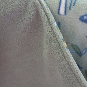 Measures 52" x 54". All edges have machine sewn edges. Back layer is solid sage green. Machine wash/dry.