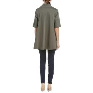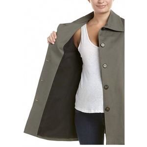 Introducing the Hatch Women's The Swing Coat Spring Jacket, a minimalist staple for your vacation wardrobe. This olive, solid-patterned casual jacket features short sleeves and a classic collar neckline, provided with a button closure for a secure fit. Designed with maternity considerations, it offers a generous bust measurement of 20.5 inches across armpits and a length of 33 inches. Country of origin and care instructions are not specified.