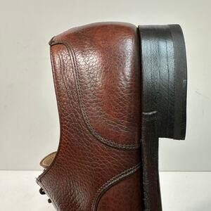 This apron fronted, split toe derby shoe is made from fine dark brown Scotch grain calfskin with a single leather sole and brand new combination heels. Manufactured in England by Crockett & Jones for Brooks Brothers.