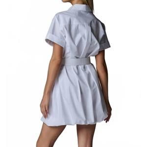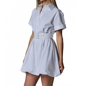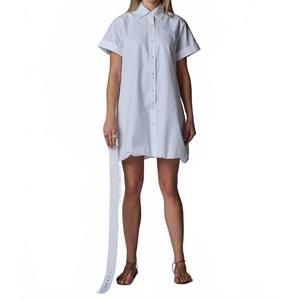Introducing the Harlow Dress by Hevron, a stylish minimalist piece designed for effortless elegance in crisp white. This dress features short sleeves and a shift silhouette, crafted from 100% cotton poplin for a relaxed yet polished look. Completion: Made in China. Closure: Button closure. Care: For best results, dry clean or machine wash cold on a gentle cycle and lay flat to dry.