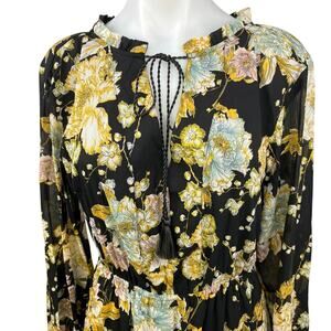 NEW H&M Black Multicolor Floral Ruffle Tassel V-neck Long Sleeve Maxi Dress Size 2