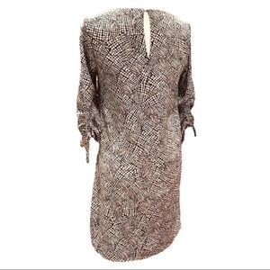 H&M shift dress, animal print is black/white/mauve-y tan — 3/4 sleeves tie at cuff, keyhole back with one button closure (extra button attached to care tag) — Sz 6 — approximate flat lay measure: 18” pit to pit, 36” length shoulder seam to hemline