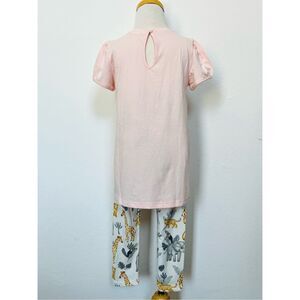 Darling animal print and screen on this set with a top and pair of leggings in soft, printed cotton jersey. Top with a small opening and button at the back of the neck and short puff sleeves. Leggings with soft elastication at the waist. Top is 100% Cotton. Bottoms are Cotton 95%, Elastane 5%. Content and size labels have been removed but this is a 3/4 (104cm). Runs closer to a 4. Top is tunic like and measures approximately 16” from bottom of neckline to hem, just over 18” from top of keyhole to hem. New without tags, never worn.
