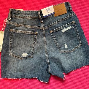 5-pocket shorts in cotton denim with distressed details. Extra-high waist, zip fly with button and slightly wider legs with raw-edge hem. Slight stretch with 98% cotton and 2% Elastan. Inseam approx 3 inches. Size 4.