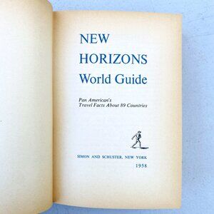 NEW HORIZONS WORLD GUIDE (1958) by Pan American World Airways is a comprehensive travel and aviation guide, published by Simon & Schuster. This vintage hardcover covers airports, airlines, and global travel insights from the 1950s, making it a valuable collectible for aviation and travel enthusiasts.