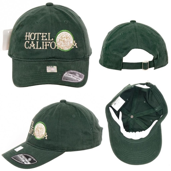 HOTEL CALIFORNIA by Explosion Caps low profile baseball cap. Collectible memorabilia. Forest green color with gold embroidery. 100% cotton. No size marked, but it's a one size fit with an adjustable strap on the back. New with original stickers. See photos for details. *Photos are of the actual item*