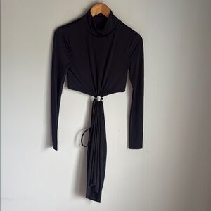 Self: 96% polyester 4% elastaneLining: 100% polyester. Made in China. Hand wash. Fully lined. Pull-on styling. Mockneck stylingGold-tone ring at center. Side cut-outsWaist tie detail