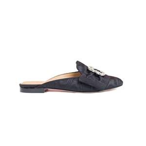.75 inch Leather Stack Heel.  Cheers mule features a festive Crystal Wreath brooch on a Black Moire upper with matching grosgrain trim. Napa Leather Lining for additional support and comfort. Leather Sole