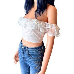 NEW HYFVE White Lace Ruffle Off the Shoulder Summer Crop Top