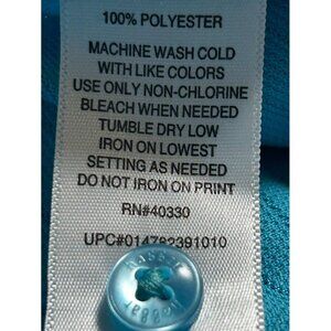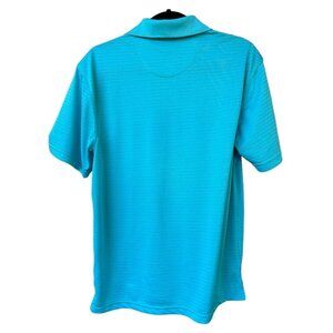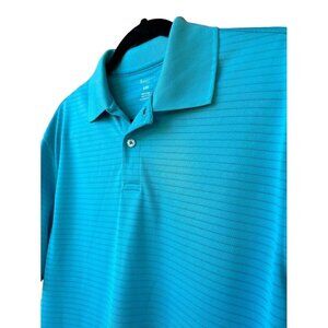 This Haggar polo shirt features a vibrant scuba blue color and short sleeves. Crafted from 100% polyester, it offers durability and comfort.