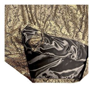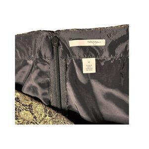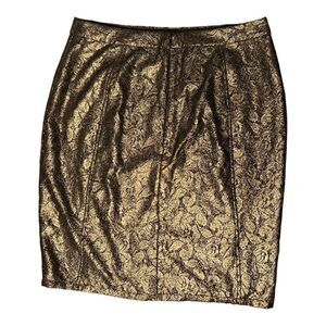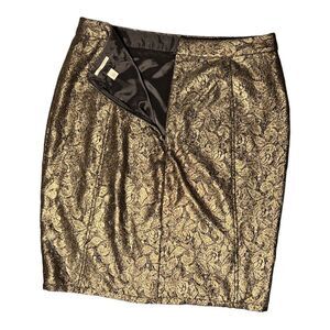 Halogen pencil skirt fully lined in silky black material covered in gorgeous sheer metallic gold lace pattern. Knee length, lightweight with back zip hook eye closure and small slit at hem.