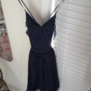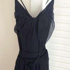 Flowy navy halter dress with open back criss cross ties. Shell is 100% silk; lining is 100% polyester. Measures approximately 29" in length from neckline to hem; center back zipper