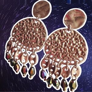 NEW Hammered Rose Gold Tone Disc Iridescent Black AB Charm Dangle Earrings