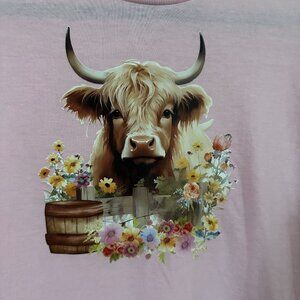 NEW handcrafted highland cow shirt. It is a size small and made out of 50% cotton 50% polyester. A Gildan shirt was used. It measures 18" from armpit to armpit and 27" from the shoulder seam to the bottom hem.