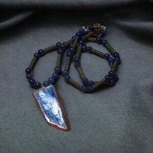 This unique necklace has a large copper-framed blue kyanite gemstone pendant centerpiece that measures approx 2" long. It is strung with lapis lazuli gemstone beads and long dark brass beads. It is 22” long and has a lobster clasp.