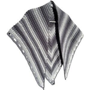 This cozy handmade shawl provides lightweight warmth and style. Its gray ombre stripes and soft yarn make it both practical and fashionable.