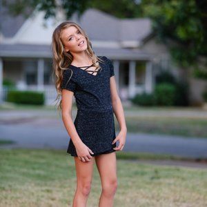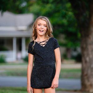 Offers welcome! Any tween star needs to have a cool romper for outings with her friends and family. And this cute, black Hannah Banana romper doesn't disappoint with fancy sparkly fabric, lattice details, overlay skirt panel and zipper closure for extra style. Just add fancy shoes and a purse and she is ready to roll.