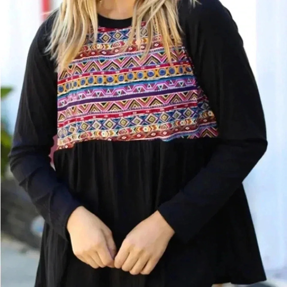 NEW Haptics BLACK RIB RAGLAN AZTEC BABYDOLL LONG SLEEVE BOUTIQUE TOP…SIZES S, M, L…95% Polyester 5% Spandex.