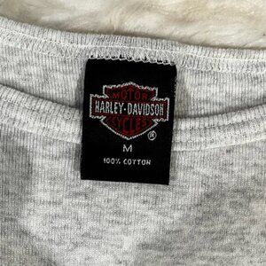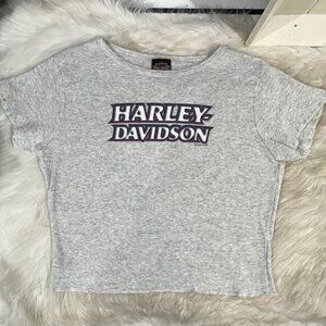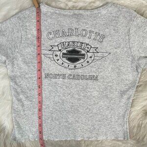 New without tags Soft and Casual Vintage 98/99 Cropped Ruffle Hem Flutter Sleeves Babydoll Logo Crop Top Tee by Harley Davidson. Charlotte, NC Harley Graphic on Back. Some Stretch. Light Heather Gray Tee with Black and Red Harley Graphic. Women’s Size Medium.