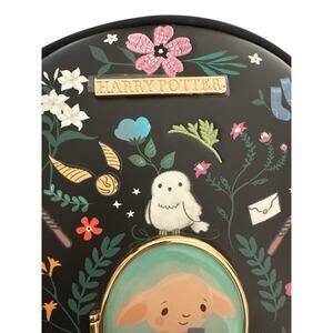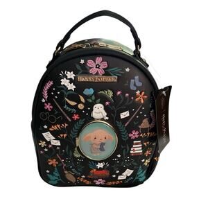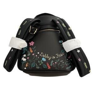 This mini backpack features a floral design, making it a unique and charming addition to any Harry Potter fan's collection. The front medallion is Dobby holding a sock in the front and Harry Potter with a birthday cake inside.