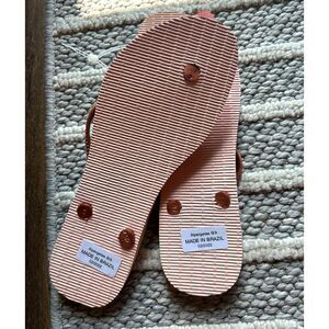 Walk out of this world in the Slim Iridescent flip flop in ballet rose. Featuring swirled luminous color patterns on the sole, slim metallic straps and a metallic Havaianas logo. Women's size 11 new with tags. The only flaw to note is the slight discoloration on the bottom of the left shoe (pictured) but it is not visible when they're worn.