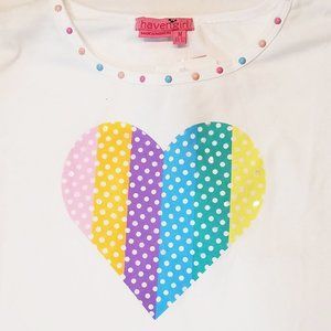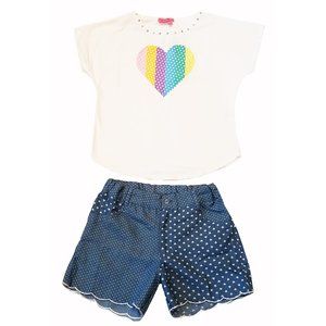 Brand New with tags, boutique item, $90 retail. Totally darling shorts set from a popular clothing line Haven Girl! We love the white loose fitting tee with appliqued heart, paired with two tone 5 pocket shorts with scalloped edging, comfy and cute! Adorable blue chambray cotton shorts are lightweight. They have elastic back and adjustable waist line with zipper front and have heart print on one side and dots print on the other. 95% cotton, 5% spandex, shambray shorts