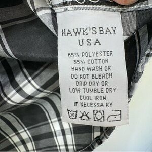 Hawks Bay USA black and white plaid short sleeve poly cotton blend Western shirt with pearl snaps and snap flap chest pockets. Lightweight and wrinkle free.
