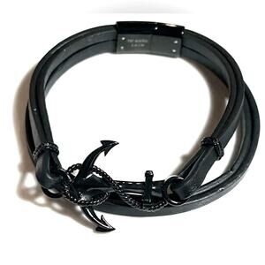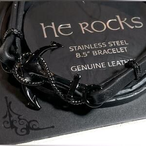 NEW He Rocks Mens BRACELET 8.5” Black Stainless Anchor 4 Leather Wrap Bands