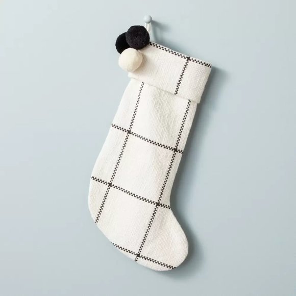 NEW! Hearth & Hand Windowpane Woven Plaid Poms Stocking Cream/Gray