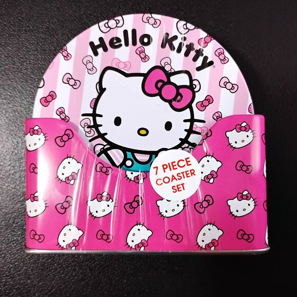 NEW! Hello Kitty Cute Pink & White Striped 7 Pc Tin & Cork Coaster Set