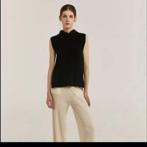 Elevated, classic wool sleeveless turtleneck sweater featuring side slits and step hem (longer in the back). Classic solid black knit - a gorgeous wardrobe staple for any season!