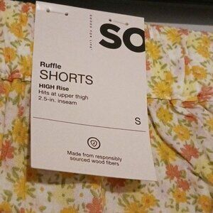 Keywords: NWT Shorts, SO Shorts, Size Small Shorts, High-Rise Shorts, Ruffle Tiered Short, White Shorts, Yellow Flowers, Pink Flowers, Summer Shorts, Floral Print Shorts, Women's Shorts, Lightweight Shorts, Boho Shorts, Breezy Shorts