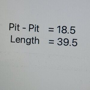 Measurements: Pit to Pit = 18.5 inches, Length = 39.5 inches