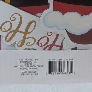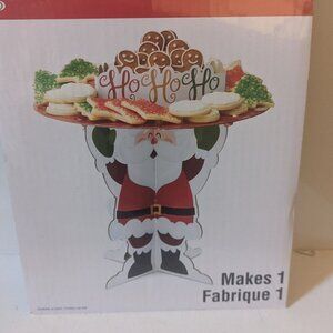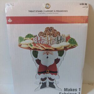 Fun, new in package, Michael's Celebrate It brand Santa treat stand. This wonderful holiday baking and party accessory is made from cardboard, designed to fold out, Santa holds aloft a tray for cookies and baked sweets with the message "Ho Ho Ho", comes in a sealed package. This winter-themed new with tags bakeware accessory is perfect for Yule parties and entertaining!