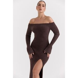 NEW House of CB Lucena Knit Off the Shoulder Dress Grey + Lurex / Espresso Large