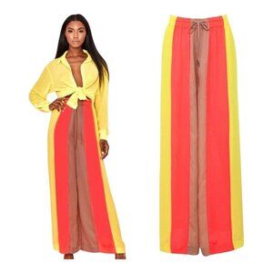 NEW House of CB Margot Women Size Medium Pants Beach Wide Leg Yellow Neon Coral.