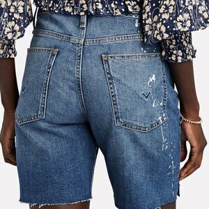 The label's Hana biker shorts in medium-wash denim are distressed with paint-splatter accents and frayed hems for an authentic worn-in feel. Belt loops. Zip fly and button closure. Five pocket styling.