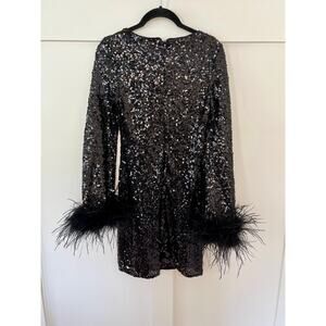 NEW Hutch Long Sleeve Mini Sequin Dress with Feather Cuffs Black Size XXS