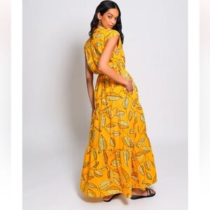 Brand new, no tags. Full maxi, elastic waist, cap sleeves, half button front, pockets on both sides, and lining that goes halfway. Beautiful golden yellow color. 100% cotton, polyester lining. No visible flaws.