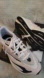 Trendy sneakers with a sleek design. Features a white and black color scheme.