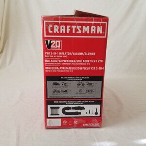 New in Box! Craftsman 3-in-1 Air Compressor for inflating tires (195/60 R15) from 0 to 40 psi, as a car vacuum and blower. Digital LCD display shows real-time air pressure, battery level, and modes (inflate/blow/vacuum) with four pressure units (KGF/CM2, KPA, PSI, BAR). The unit features an ergonomically designed handle with a soft rubber grip and storage slot with vacuum accessories.