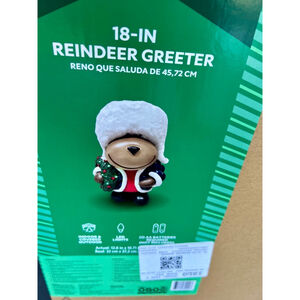 New in box. Reindeer door greeter. Animatronic lighted decoration. Approx. 18”. Battery operated. LED lights. Fur trim accents. Hand painted. Holiday Living. New in box, did take out to photograph.