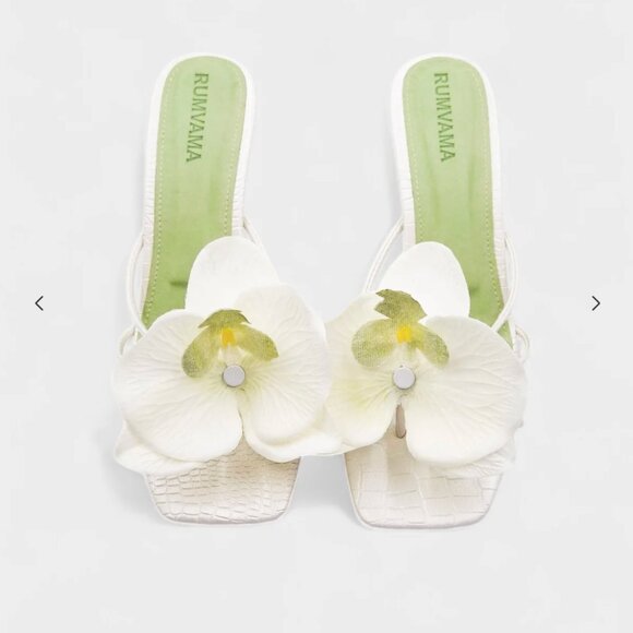 🥿 Style: Open-toe sandal with pearl floral appliqué